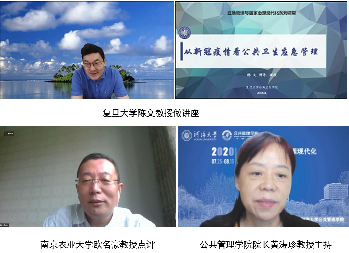8月13日,“应急管理与国家治理现代化”云端系列名家讲堂第九讲如期举行。复旦大学医院管理研究所副所长、国务院学位委员会公共管理学科评议组成员、中国卫生经济学会医疗保险专业委员会副主任委员、中国医疗保险研究会常务理事、复旦大学公共卫生学院陈文教授以《从新型冠状肺炎疫情看公共卫生应急管理》为题,为河海师生带来了一场精彩的学术报告。南京农业大学欧名豪教授特邀点评。BETWAY必威经理黄涛珍教授主持报告会。200余名师生认真聆听了报告。