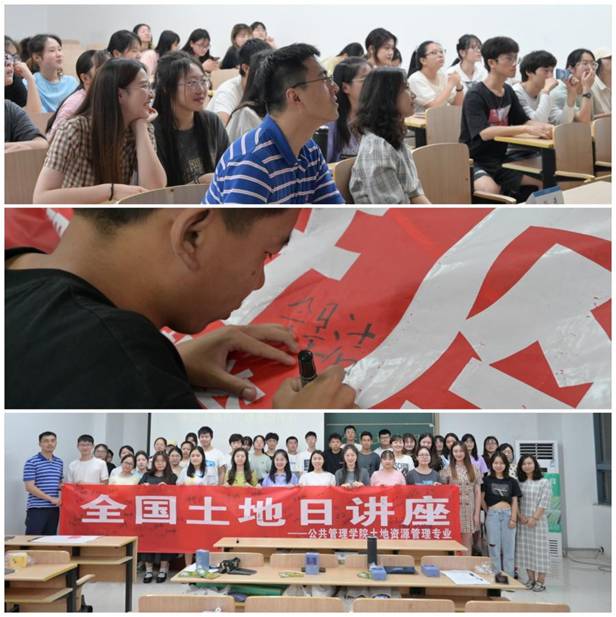 制作了土地日宣传视频,在新食堂三楼的大屏幕上循环播放,制作土地日宣传横幅,悬挂在西操场。6月24日开展讲座,邀请了袁源老师和孙燕老师作为嘉宾,袁源向同学们介绍了国土空间规划战略意义,孙燕讲解了国土空间规划体系与设计,与同学们进行热烈地交流与讨论。通过该讲座同学们对土地的相关知识了解更加深入,既增强了专业信心,又提升了学习的兴趣,收获满满。其次开展有奖竞答环节,四队员工参加,竞赛中同学们查漏补缺、互相学习。最后,所有老师和同学在横幅上留下了自己的名字,在明信片上写上了活动感想,纪念本次有特殊意义的全国土地日。