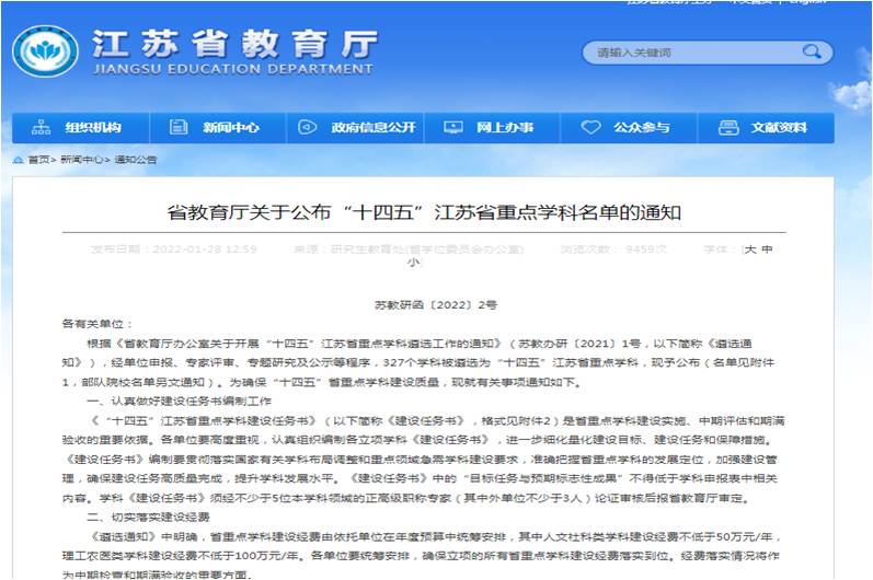 近日,江苏省教育厅公布了“十四五”江苏省重点学科名单,公司社会学学科成功入选A类,公共管理学科成功入选B类。是本次公司申报成功的10个学科之中2个文科类学科。