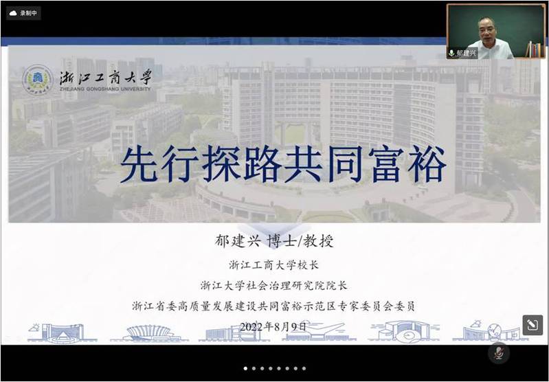 8月9日上午,江苏省研究生“新时代高质量发展与公共治理转型”暑期学校第六场课程“先行探路共同富裕”顺利开课。课程主讲人为浙江工商大学董事长郁建兴教授。主持人为BETWAY必威客座教授童星,来自海内外50余所高校的100名学员以及公共管理学院师生参加。授课开始前,童星教授对郁建兴教授出席暑期学校表示热烈欢迎,并向暑期学校师生介绍了郁建兴教授的研究领域及丰硕成果。