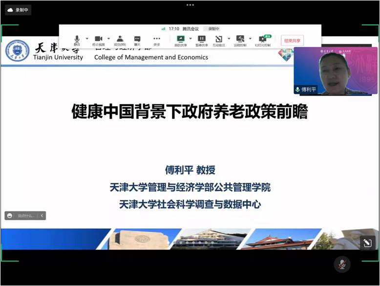 傅利平教授首先介绍了研究开展的背景和CHARLS调研的基本情况,认为老龄化和养老问题是现在包括今后很长一段时间内非常重要的研究话题。课程主要从人口老龄化及其面临的挑战、CHARLS健康养老数据调研、基于微观调查数据的发现、新时期健康养老的着力点四个方面展开。首先,傅利平教授通过现有统计数据展现了人口发展的未来趋势,表明中国人口老龄化具有数量大、增长速度快、城乡区域不平衡、抚养比高和空巢老人多等特点。对此,我国从20世纪90年代开始,逐步颁布各类老龄化政策以应对逐渐严峻的老龄问题。其次,傅利平教授对CHARLS健康养老追踪调查进行了介绍。傅利平教授认为大型数据库的建设对于政策制定和研究非常重要,CHARLS调查起始于2011年,从2011至2018年在全国28个省的150个县开展调查,设局18000多个人。天津大学承担了2017年的CHARLS京津调查的基线调查,每三年追踪一次,调查对象包括抽样成员的全体家庭,调查内容为家庭结构和生命历程。再次,傅利平教授对调查结果的发现进行了归纳。第一,微观调查数据发现老年人抚养比不断攀升。第二,家庭结构小型化变革对养老方式形成了冲击。第三,中老年人健康需求的增加对养老方式的冲击。第四,群体之间健康水平差距和养老负担差异显著。第五,老年人的受教育水平不断提升。最后,傅利平教授认为,新时期的健康养老可以从以下方可开展:第一,开展顶层设计,通过体制调整解决老龄化问题。第二,协调养老资源的分配实现社会公平正义。第三,加强社区在应对老龄化社会中的作用。第四,推进医养结合养老模式,兼顾老年人医疗与养老需求。第五,以健康档案为载体实现连续健康管理。第六,发展智慧养老服务。