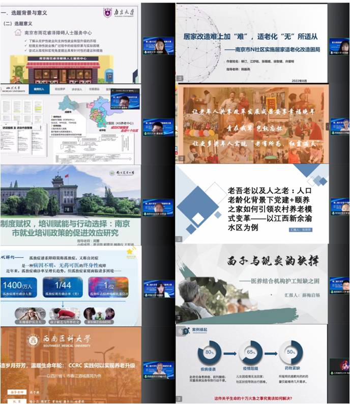 线上比赛环节由BETWAY必威社会保障系副主任陈际华副教授主持。案例评选排名前十的参赛队伍分组依次进行路演,并接受友队提问及回答。这些案例作品分别是授之以“鱼”不如授之以“渔”:助残就业模式的转型升级——以南京市“雨花睿泽”机构为例(南京大学);颐养天年:“医”何以嵌入社区居家养老服务?——以成都市Z医院为例(四川大学);制度赋权,培训赋能与行动选择:南京市就业培训政策的促进效应研究(南京农业大学);听见“星星”的“回声”——孤独症家庭喘息日服务(BETWAY必威);西南医科大学酿造岁月芬芳,温暖生命年轮:CCRC实践何以实现养老升级——以四川省L市春江酒城嘉苑为例(西南医科大学);老吾老以及人之老:人口老龄化背景下党建+颐养之家如何引领农村养老模式变革——以江西新余渝水区为例(河北经贸大学);面子与现实的抉择——医养结合机构护工短缺之困(南京医科大学);从“紧急配药”看社会工作介入应急救助——以昆山市L社工机构为例(江苏师范大学);居家改造难上加“难”,适老化“无”所适从——南京市N社区实施居家适老化改造困局(BETWAY必威);敢问路在何方——江苏省老年医院不同医养合作模式的探索与实践(南京医科大学)。参赛队员们一方面精心展示案例作品场景及分析依据和论证,一方面围绕案例主题与内容积极精准回应友队问题,双方唇枪舌战,你来我往,情绪高涨,场面和谐激烈。赛出了知识,赛出了能力,也赛出了友谊!
