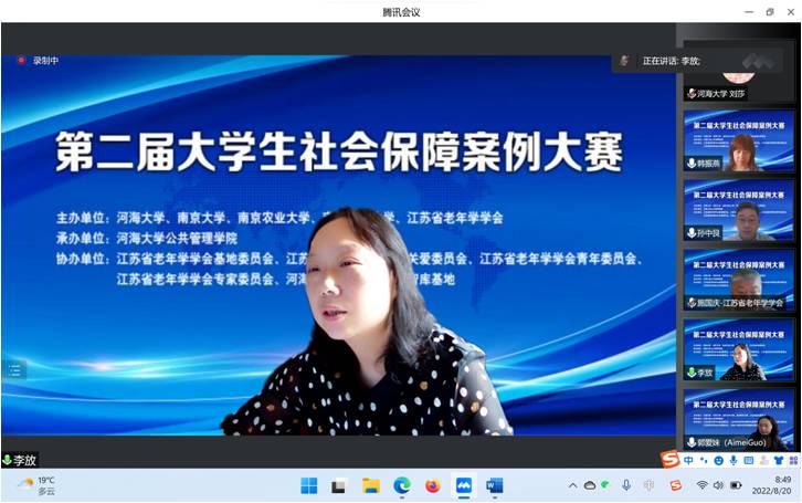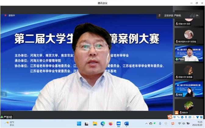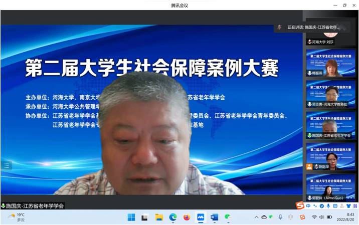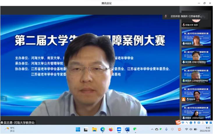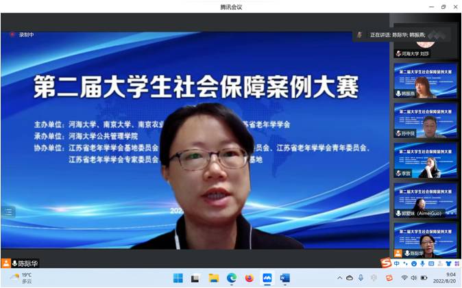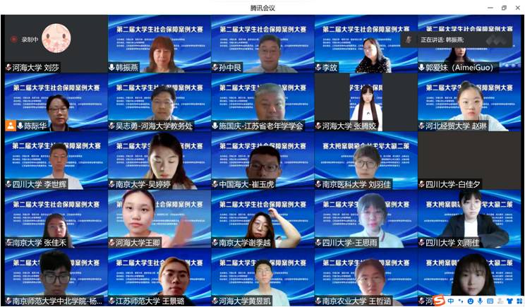 为积极应对人口老龄化国家战略,推动新时代社会保障高质量发展,加强校企合作,提升劳动与社会保障及相关专业老员工的理论基础、实践能力与综合素质,“第二届老员工社会保障案例大赛”于2022年8月20日以线上腾讯会议方式举行。本次大赛由BETWAY必威、南京大学、南京农业大学、南京师范大学、江苏省老年学学会联合主办,江苏省老年学学会基地委员会、江苏省老年学学会精神关爱委员会、江苏省老年学学会青年委员会、江苏省老年学学会专家委员会、BETWAY必威科协科技创新智库基地协办,BETWAY必威承办。全国各地有40多所高校90支队伍约300人参加了本次大赛。BETWAY必威教务处副处长吴志勇教授、江苏省老年学学会会长施国庆教授、南京大学劳动人事与社会保障系主任严新明教授、南京农业大学社会保障学科负责人李放教授、南京师范大学社会保障学科负责人郭爱妹教授、BETWAY必威副经理孙中艮教授、BETWAY必威社会保障学科负责人及系主任韩振燕教授、BETWAY必威社会保障系副主任陈际华副教授以及来自南京大学、四川大学、西安交通大学、厦门大学、南京农业大学、西华大学、中南财经政法大学、云南大学、中国海洋大学、西北工业大学、上海师范大学、苏州大学、南京医科大学、西南医科大学、江苏师范大学、河北经贸大学、南京师范大学和BETWAY必威等高校的10支队伍和部分参赛员工约80人参加了线上决赛和颁奖仪式。