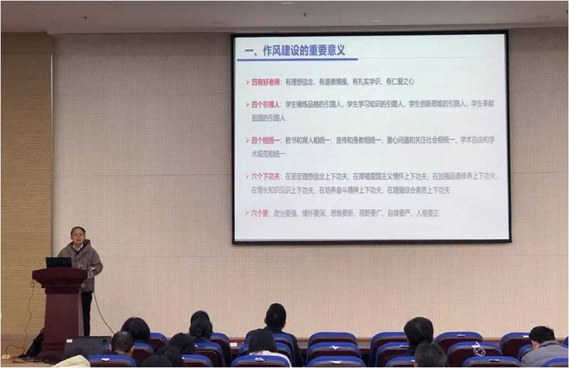 蒲晓东书记做了“锲而不舍推进高校教师作风和纪律建设”的专题报告。他指出加强自身作风建设,是改进教风带动学风的现实需要,是推进教师队伍建设的一项长期任务。导师要既精通专业知识、做好“经师”,又涵养德行、成为“人师”,努力做精于“传道授业解惑”的“经师”和“人师”的统一者。在培养研究生的同时,也要关注和关心员工的心理情况,尊重员工、理解员工、引导员工,在学业上和生活上点面结合、因材施教。
