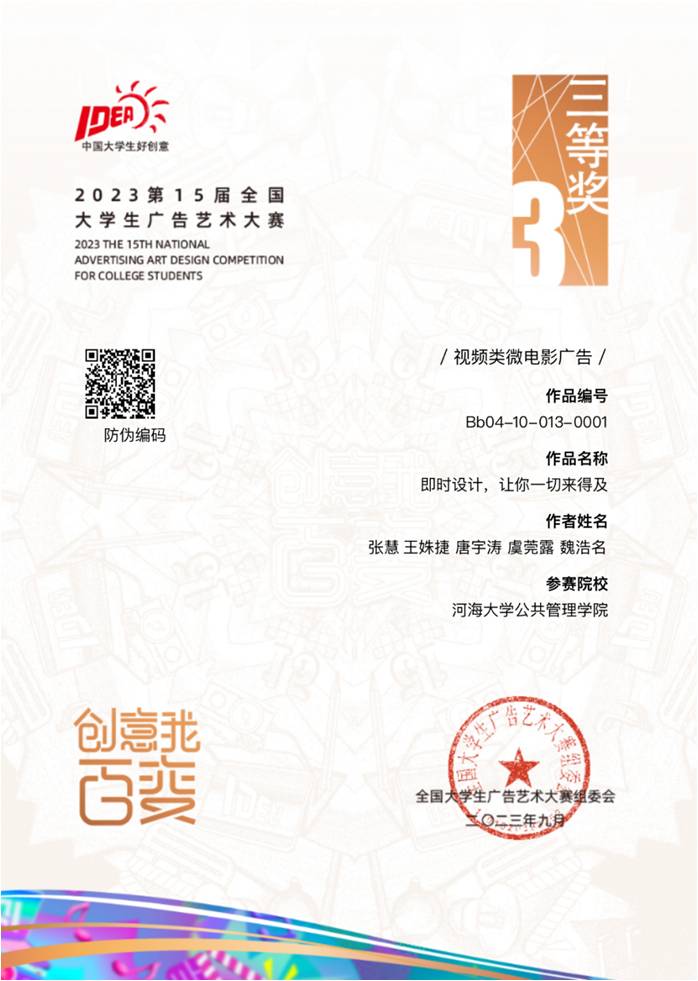 020级广播电视学张慧团队的视频类微电影广告作品《即时设计,让你一切来得及》获全国总评审三等奖。