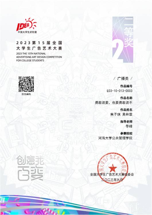 2020级播音与主持艺术专业焦子琪、2020级广播电视学吴林霏团队的广播类作品《勇敢说要,也要勇敢说不》获全国总评审二等奖。