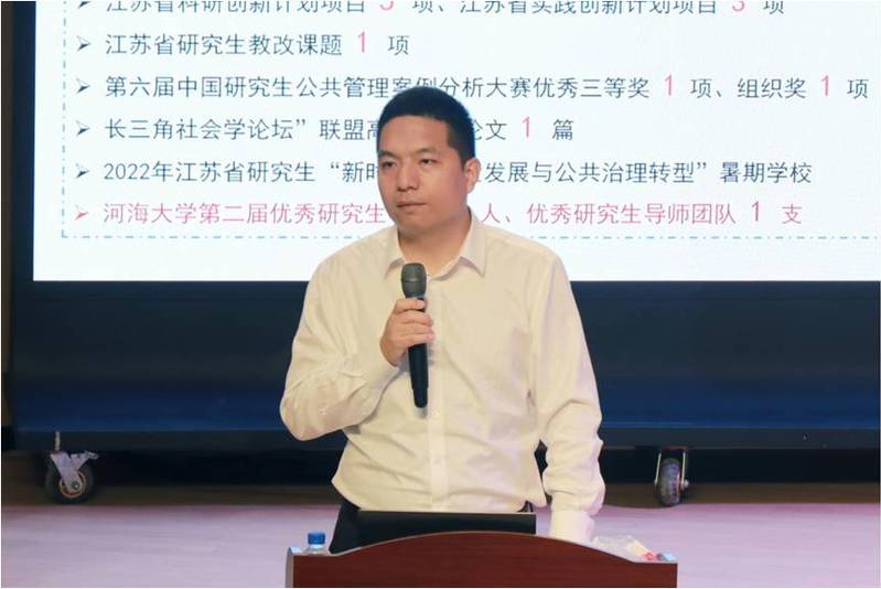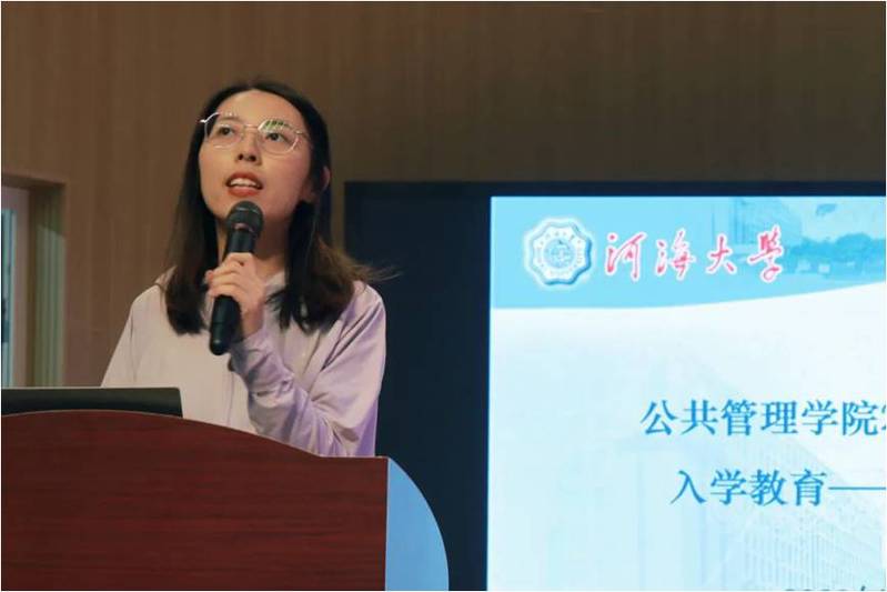 2023级社会学专业陆安琪同学作为新生代表分享了对“艰苦朴素,实事求是,严格要求,勇于探索”十六字河海校训的理解,并介绍了个人在研究生阶段的目标规划,呼吁同学们一起努力拼搏,走出宽广未来,续写河海辉煌。