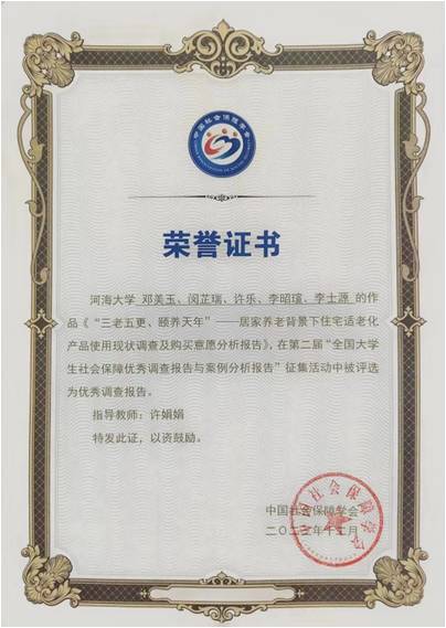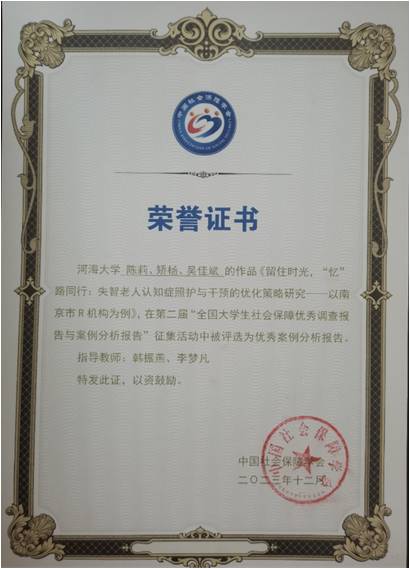 由公司社会保障系韩振燕老师、李梦凡老师指导,劳动与社会保障专业2021级本科生陈莉团队(成员矫扬、吴佳斌)撰写的《留住时光,“忆”路同行:失智老人认知症照护与干预的优化策略研究》被评为“社会保障优秀案例分析报告”;由商学院许娟娟老师指导,劳动与社会保障专业2021级本科生邓美玉团队(成员闵芷瑞、许乐、李昭瑄、李士源)撰写的《三老五更,颐养天年——居家养老背景下住宅适老化产品使用现状调查及购买意愿分析》被评为“社会保障优秀调查报告”,并受邀在大会上分享交流。